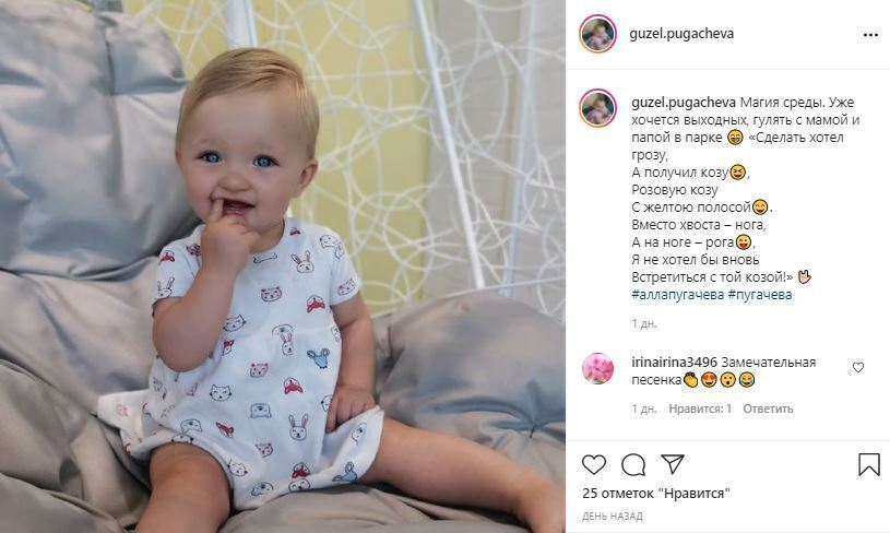 Влад — сын Евгения — страдал от наркотической зависимости. Пугачева лечила его в разных клиниках. В 29 лет парень стал инвалидом, сделав себе укол в ногу. Тогда он случайно задел нерв, в результате чего у него отнялись конечности. Только после длительного лечения в Израиле молодой человек пришел в себя. Певица взяла на себя опекунство над сыном племянника, пока тот искал себе новую жену. Несколько лет назад Влад познакомился с девушкой из Казани по имени Гузель и та 11 месяцев назад родила ему дочку — Аллу. Снимок малышки девушка недавно опубликовала на своей странице в Instagram****. Подписчики были удивлены, ведь девочка очень похожа на свою звездную родственницу.