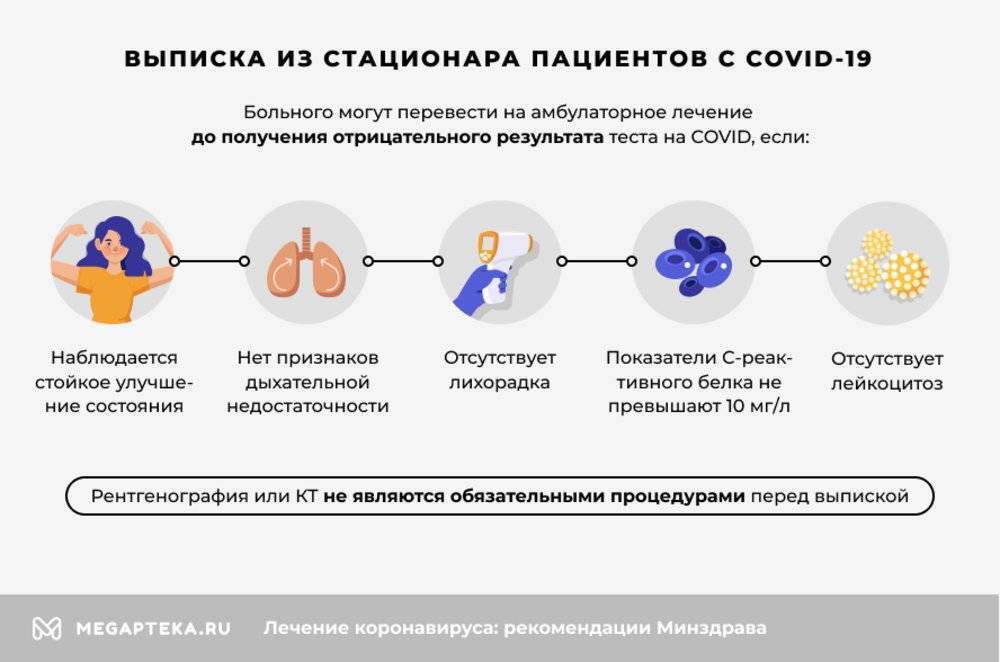 Также изменился порядок выписки из стационара. Теперь больного могут перевести на амбулаторное лечение до получения отрицательного результата теста на COVID.