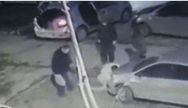 На улицу Штеменко прибыли несколько автомобилей. Дальнейшее сняли камеры наружного наблюдения на жилом доме. Видно, как таксист первым бросается на клиента и бьет его по затылку. Пошатываясь, Сергей отходит на пару метров, снимает кофту и пытается нанести ответный удар.