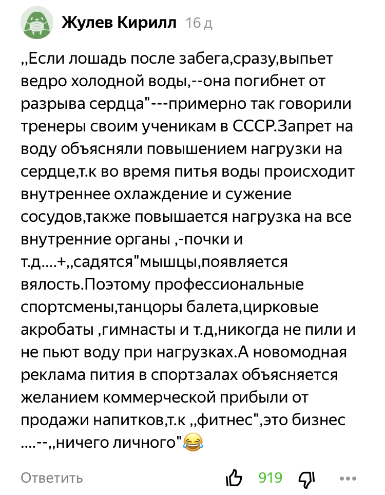 А теперь к Вам вопрос: как Вы думаете, почему Советские треннеры запрещали пить воду и как они это объясняли Вам?