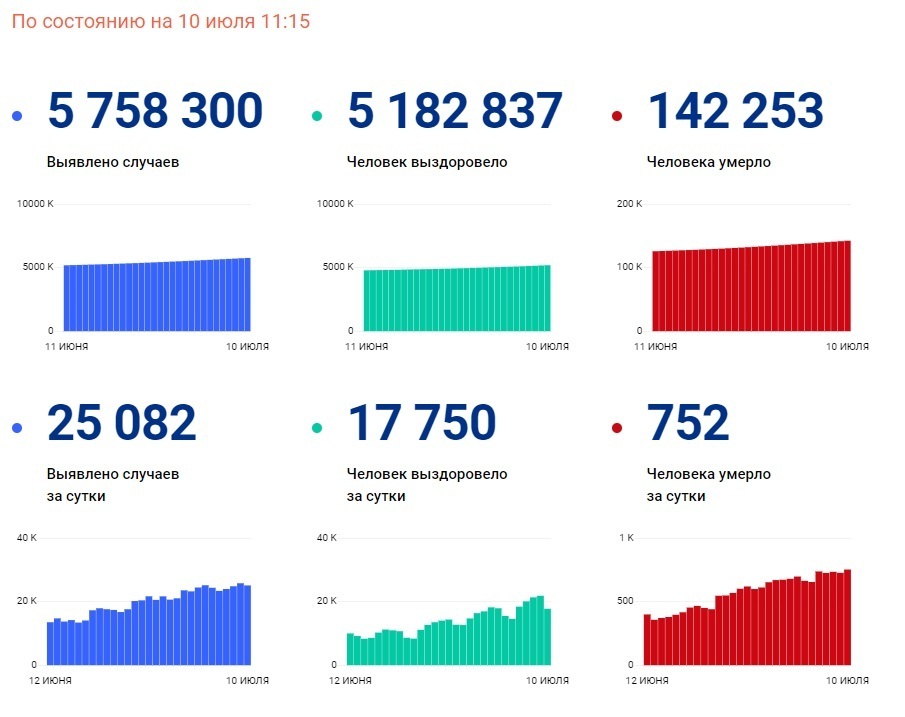 России на 10 июля выявлено 25 082 случая заражения коронавирусной инфекцией и 752 случая смерти.
