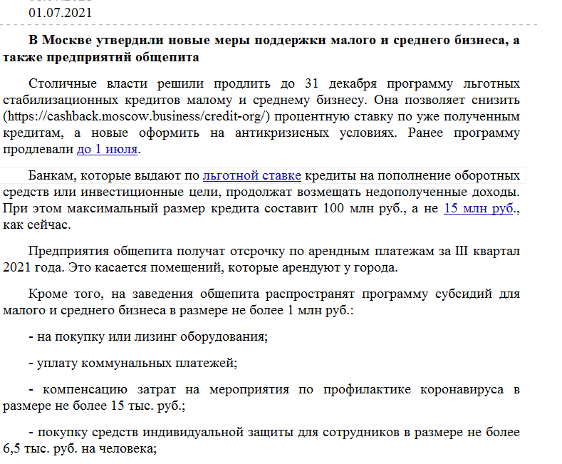 В Москве утвердили новые меры поддержки малого и среднего бизнес, а также предприятий общепита.