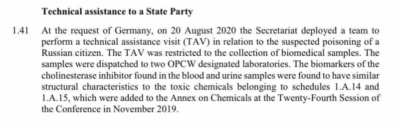 "По запросу Германии 20 августа 2020 года Секретариат направил группу технической помощи (TAV) в связи с подозрением на отравление гражданина России (Навального). TAV ограничился сбором биомедицинских образцов. Образцы были отправлены в две лаборатории, назначенные ОЗХО. Обнаружено, что биомаркеры ингибитора холинэстеразы, найденные в образцах крови и мочи, имеют сходные структурные характеристики с токсичными химическими веществами, относящимися к спискам 1.А.14 и 1.A.15, которые были добавлены в Приложение по химическим веществам на Двадцать четвертой сессии конференции, состоявшейся в ноябре 2019 года", — гласит пункт отчета.