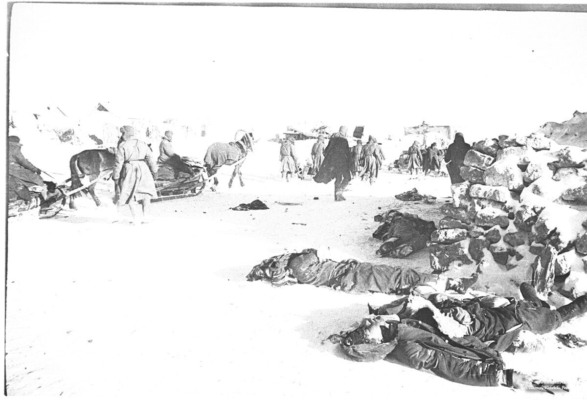 Сталинград Убитые немцы, сложенные штабелями (зима,)