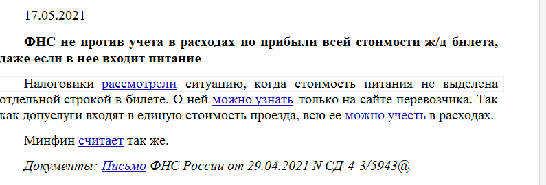 ФНС не против учета в расходах по прибыли всей стоимости ж/д билета, даже если в нее входит питание.