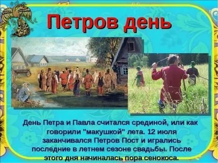 В народном календаре Петров день — это «макушка лета», жара, расцвет природы, сенокос, летние свадьбы, гуляния, купания, прыжки через костер и т. д.