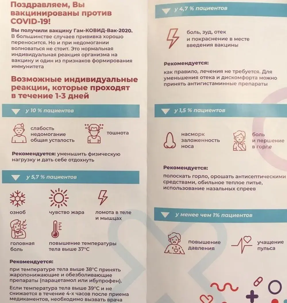 Официально перечень побочных эффектов от «Спутника V» невелик. Он дан в памятке для прошедших вакцинацию.