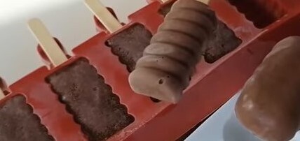Как только молочно-шоколадная масса закипит, вводим разведённый крахмал. Постепенно смесь начнет загустевать. На медленном огне, постоянно помешивая, доводим до кипения - и можно остужать. Разливаем остывшую массу по формочкам. Можно использовать любые формы, подойдут, например, бумажные стаканчики. В специальные формочки для мороженого предварительно вставляем деревянные палочки.
