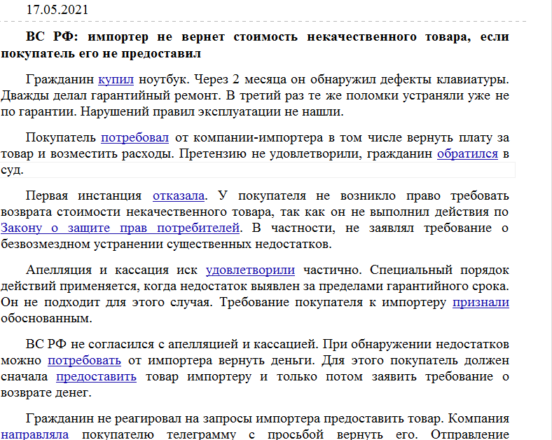 ВС РФ: импортер не вернет стоимость некачественного товара, если покупатель его не предоставил.