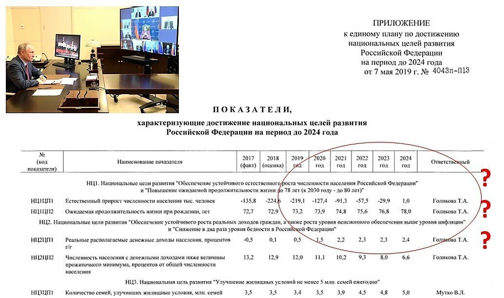 Есть такой «Единый план по достижению национальных целей развития Российской Федерации на период до 2024 года» , в котором черным по белому написано (вернее, в Приложении к нему от 7 мая 2019 года) что Голикова отвечает, что прирост населения в 2021 году будет минус 91 тысяча 300 человек в России (пока минус) – это уже лучше чем в 2017 г. – тогда минус 135 тысяч 800 было. А в 2024 году Голикова должна сделать так, чтобы "единица" была. И это не только написано, но и подписано. А еще она отвечает за то, что продолжительность жизни в этом году должна быть 74,8 лет, а в 2024 – уже 78.