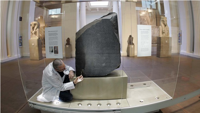 Розе́ттский ка́мень — стела из гранодиорита, найденная в 1799 году в Египте возле небольшого города Розетта (теперь Рашид), недалеко от Александрии, с выбитыми на ней тремя идентичными по смыслу текстами, в том числе двумя на древнеегипетском языке — начертанными древнеегипетскими иероглифами и египетским демотическим письмом, которое представляет собой сокращённую скоропись эпохи позднего Египта, и одним на древнегреческом языке. Древнегреческий был хорошо известен лингвистам, и сопоставление трёх текстов послужило отправной точкой для расшифровки египетских иероглифов. С 1802 года Розеттский камень хранится в Британском музее (инвентарный номер EA 24).
