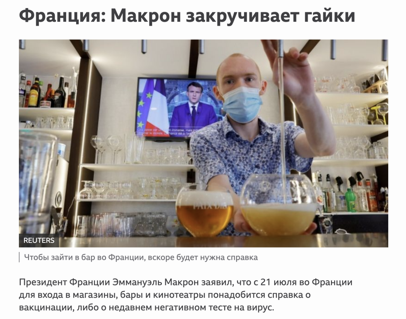 В понедельник Эммануэль Макрон заявил, что с 21 июля во Франции в бары, рестораны, больницы, дома престарелых, поезда и иной общественный транспорт, самолеты, кинотеатры и иные места проведения общественных мероприятий будут впускать только по сертификату о вакцинации, либо свежему негативному ПЦР-тесту. Президент Франции подчеркнул, что с осени тесты станут платными.