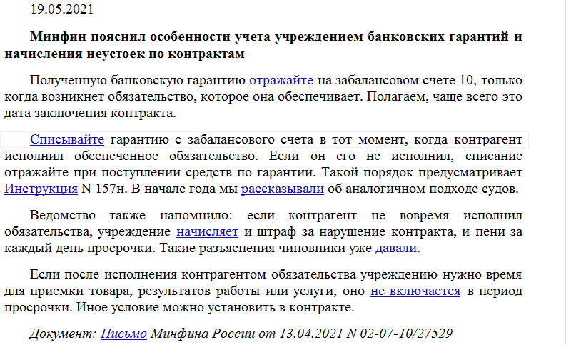 Минфин пояснил особенности учета учреждением банковских гарантий и начисления неустоек по контрактам