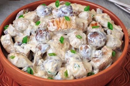 Зеленый лук мелко нарежьте и посыпьте готовое блюдо перед подачей. Подавать свинину, тушенную с грибами, в сметанном соусе, можно со свежим хлебом, картофельным пюре, макаронами или гарниром из круп.