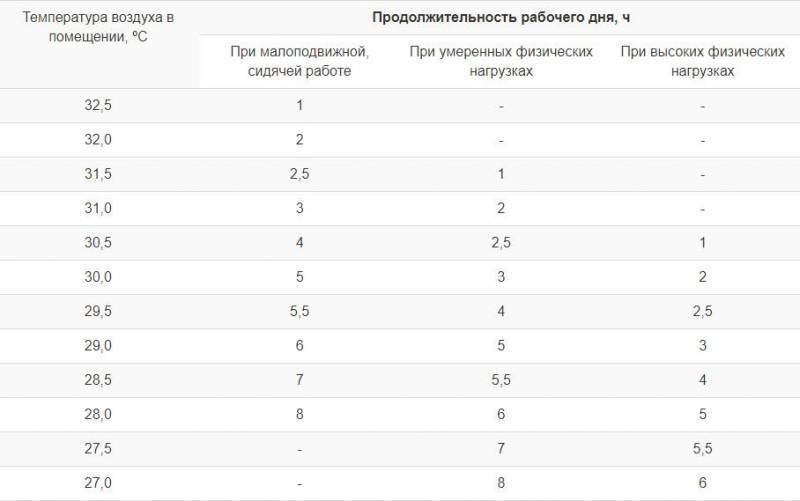 Также в связи с жарой на предприятии, как вариант, может быть введено сокращенное рабочее время и/или изменено начало и окончание рабочего дня, и/или увеличен обеденный перерыв до 3 — 4 часов с целью исключения работы в наиболее жаркий период с 13 до 16 часов.