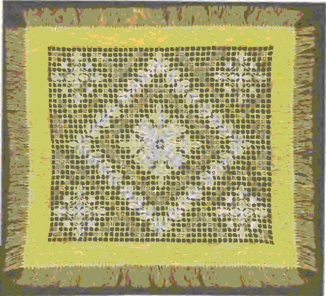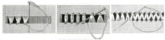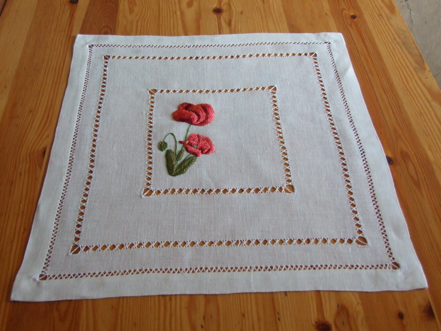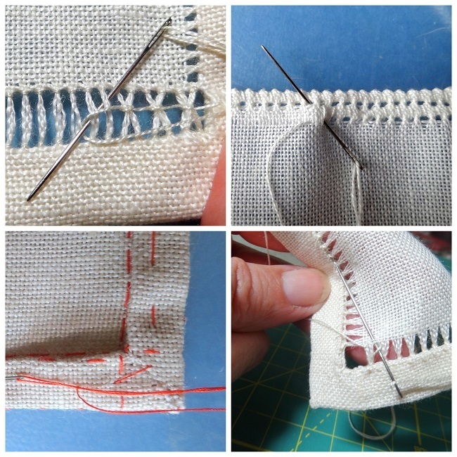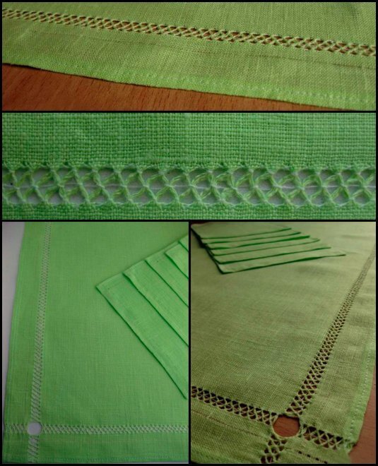 Для дорожек мережки выдерните по 5 – 6 нитей, а сетку делайте по следующей схеме: 3 нити выдерните, 2 – оставьте и т.д. Сетку выполните, используя технику строчевых работ, а кроя её обработайте швом «валик».
