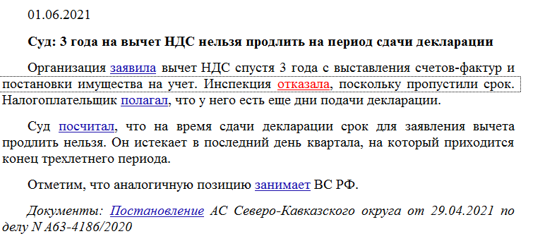 Суд: 3 года на вычет НДС нельзя продлить на период сдачи декларации.