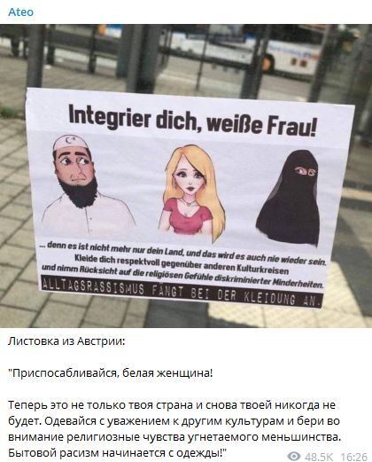 На улицах Австрии появились панические листовки, информирующие население о внедряемом в общество "обратном расизме", при котором "угнетаемые меньшинства" начинают диктовать свою волю большинству. "Приспосабливайся!" - говорится в подписи.