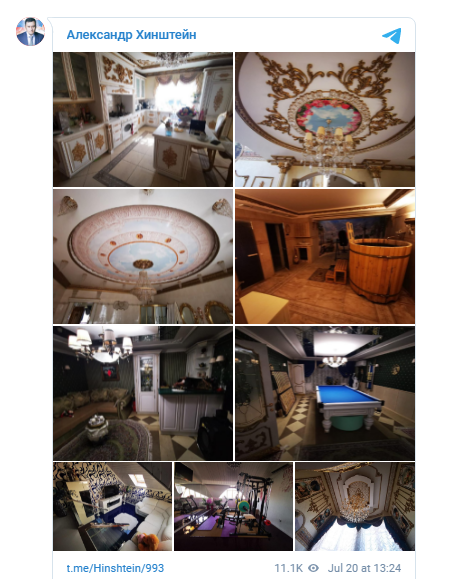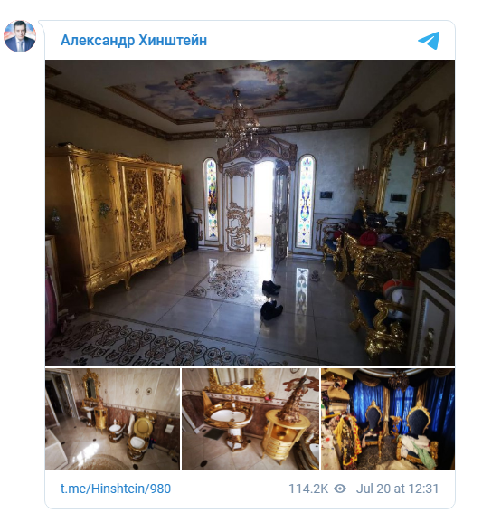 Депутат также опубликовал фотографии из дома Сафонова. На кадрах можно увидеть различные предметы роскоши: обитую бархатом мебель, позолоченные шкафы, зеркала, тумбочки и унитаз.