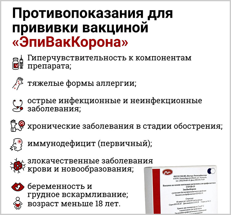 Вторая зарегистрированная в России вакцина «ЭпиВакКорона» от центра «Вектор». Противопоказания у вакцины во многом повторяют те, что есть у «Спутника V»: гиперчувствительность, тяжелые формы аллергии, острые заболевания и обострение хроники, несовершеннолетие, беременность и кормление грудью. К списку добавляются первичный иммунодефицит, злокачественные заболевания крови и новообразования.