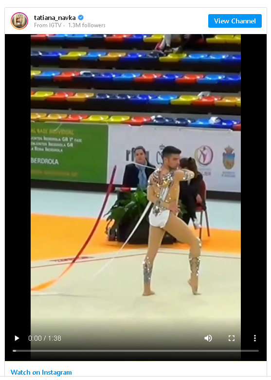 В своём ****.com%2Ftv%2FCRlOXxEgAmS%2F%3Futm_source%3Dig_embed%26ig_rid%3Df6ffaf67-73fa-45bc-a956-b37e0a3e4668">инстаграм-аккаунтеона выложила фрагмент одного из выступлений: на нём можно увидеть мужчину довольно брутальной внешности, одетого в облегающий гимнастический купальник и лосины с блёстками. Спортсмен довольно ловко исполнял пируэты с лентой, но вопросы у супруги Дмитрия Пескова возникли не к его мастерству.