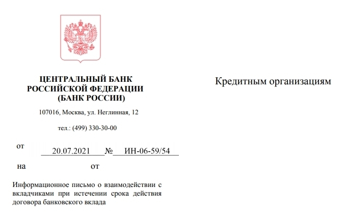 Информационное письмо о взаимодействии с вкладчиками при истечении срока действия договора банковского вклада