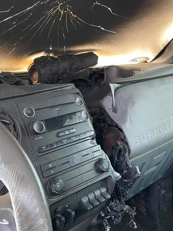 Удар молнии разбил лобовое стекло, а затем попал внутрь и расплавил внутренние компоненты автомобиля. Удар попал прямо в приборную панель, разорвав ее на две части. Сильно обгорело лобовое стекло. Расплавленный пластик свисал с верхнего вещевого отсека. Почти все внутри машины расплавилось от невероятной жары.