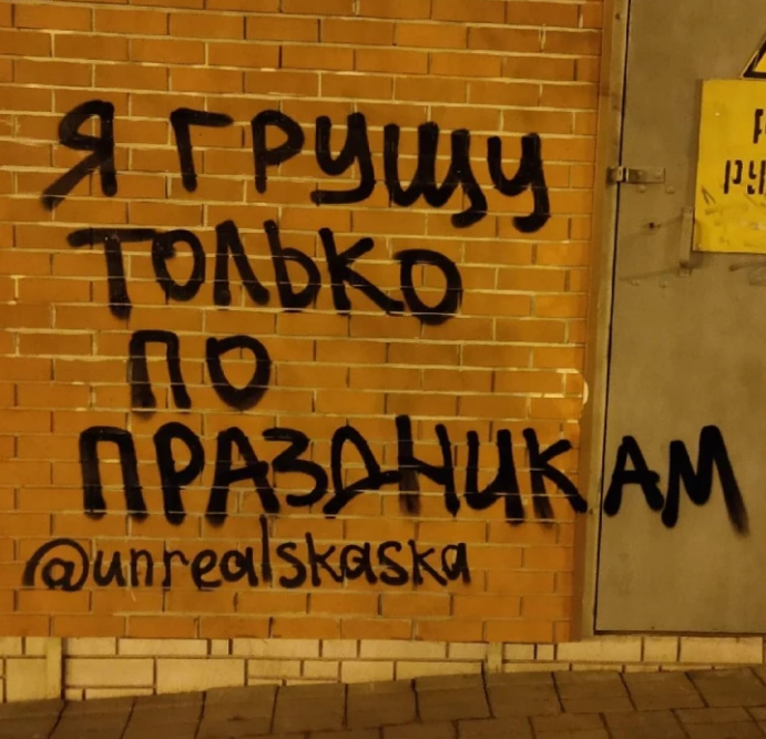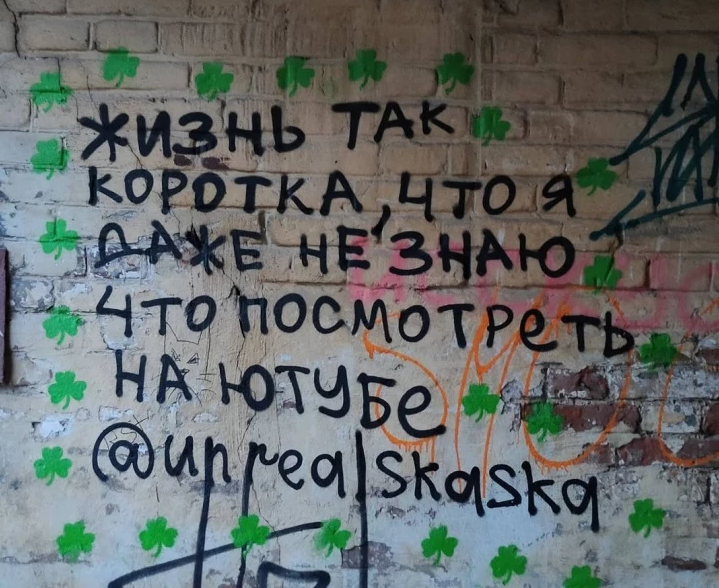 Если вы живете в Уфе, то наверняка видели в разных районах города странные надписи и рисунки, подписаные тегом unrealskaska. Они тут и там: на стенах, на дорогах, на заборах, и их становится всё больше и больше. Автор как будто обращается ни к кому и к каждому сразу, словно высказывает просто мысли вслух на темы личности и общества, политики и религии, искусства.