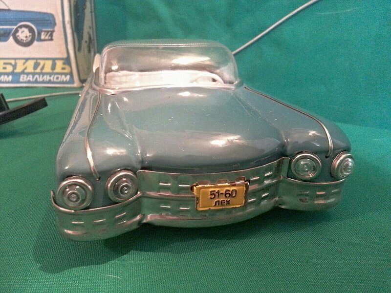 Картонная коробка, которая состояла из двух половинок. На одной стороне изображена непосредственно сама машинка. Изготовлена она была в Ленинграде, а внешне напоминает Cadillac Eldorado 1960-го модельного года. Внутри коробочки немаленькая такая машинка, пульт и гибкий тросик. Ну и инструкция, разумеется.