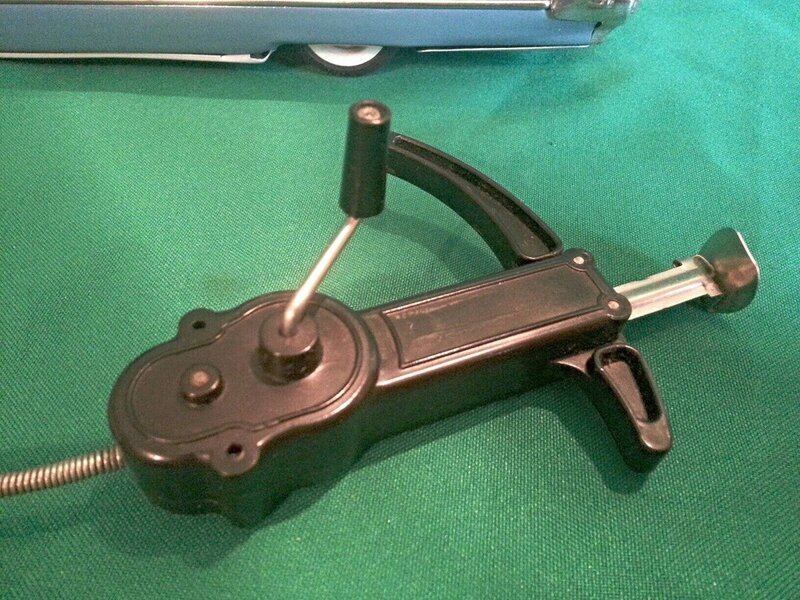 Управляется она с помощью рукоятки на пульте, все просто - крутим в одну сторону и машинка едет вперед, а если в другую - назад.
