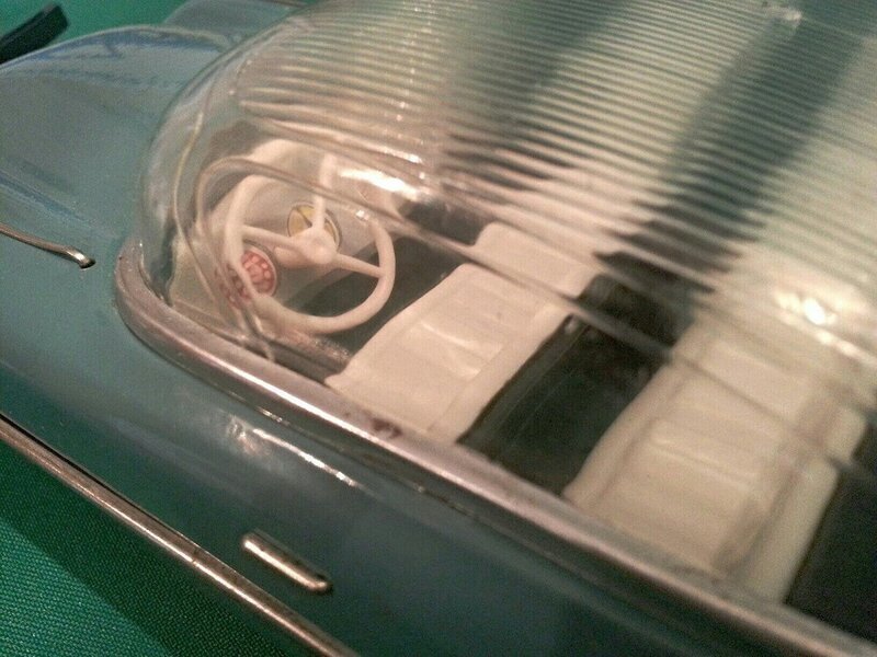 Решетка радиатора, светотехника, наружные дверные ручки, молдинги сделаны отдельными деталями. Днище машинки тоже сделано из металла. Сзади располагается тросик, привод осуществляется через заднюю ось, а передние колеса поворачиваются. На колесах хромированные колпаки, которые полностью закрывают диски.