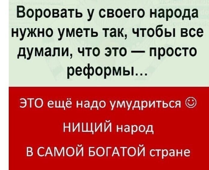 Василий ты издеваешься чтоли. """Государство должно гарантировать""" с твоих слов. Ничего эта рашка никому не должна и не гарантирует. Сам Гарант ниче не гарантирует,а может только обещать с высоких трибун. А государство способно только вводить еще больше налогов,сборов,пошлин,штрафов и т.д..-- т.е. обобрать народ до нитки. А гарантировать оно не может априори. Еще осталось ввести селянам и дачникам налог на фруктовые деревья и ягодные кусты ,как было при Никитке Сергеиче,да тогда сдавали селяне свинные,говяжьи,бараньи шкуры и шерсть,да сдавали криные яйца да сливочное масло.Чур меня,чур меня,от кутюр.Владельцев крупного рогатого скота извели в своё время. Доберутся еще. Депутаты народец ушлый. Придумают еще немало пакостей народу.