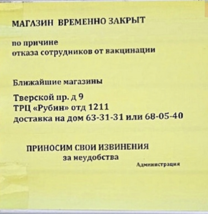 Сотрудники магазина отказались вакцинироваться от короновируса, из-за чего магазин закрылся!