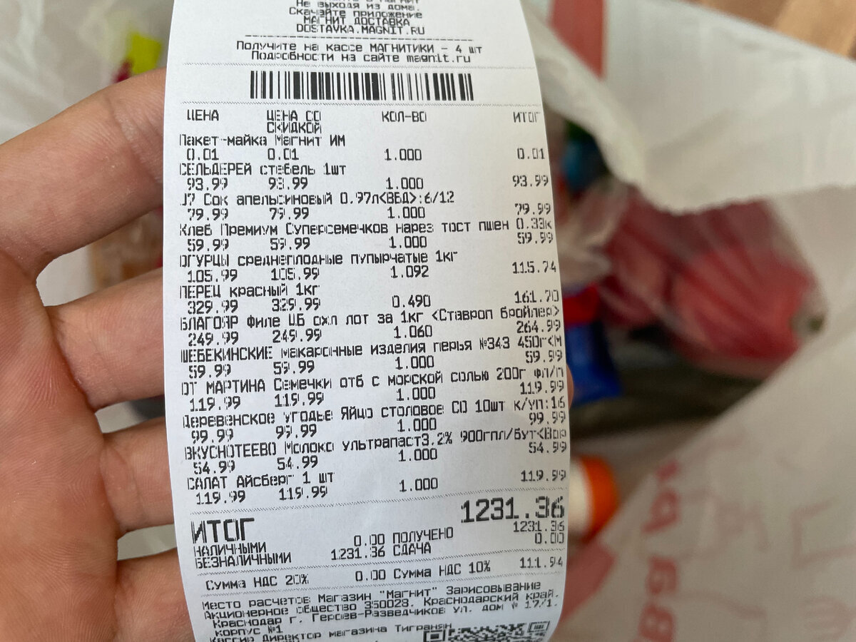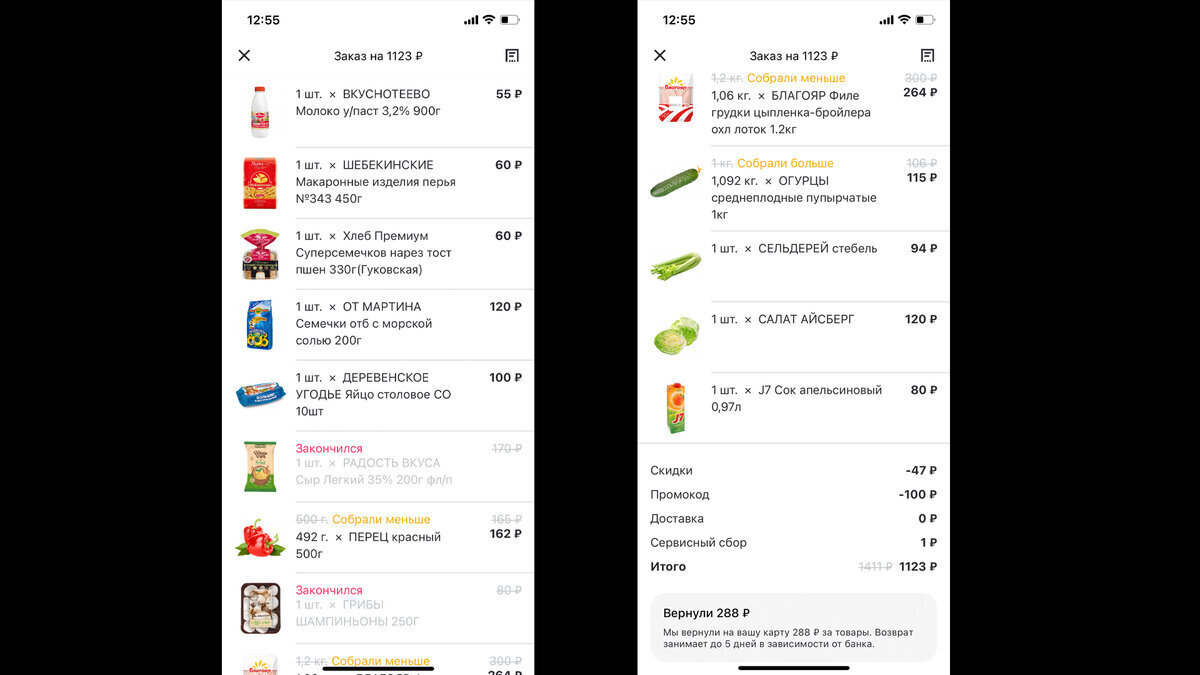 Изначально итоговая сумма была 1411 руб, но потом снизилась до 1123, потому что два товара отменили. Деньги за них вернутся на карту. На момент написания статьи еще не вернулись (прошло примерно полтора часа после доставки).