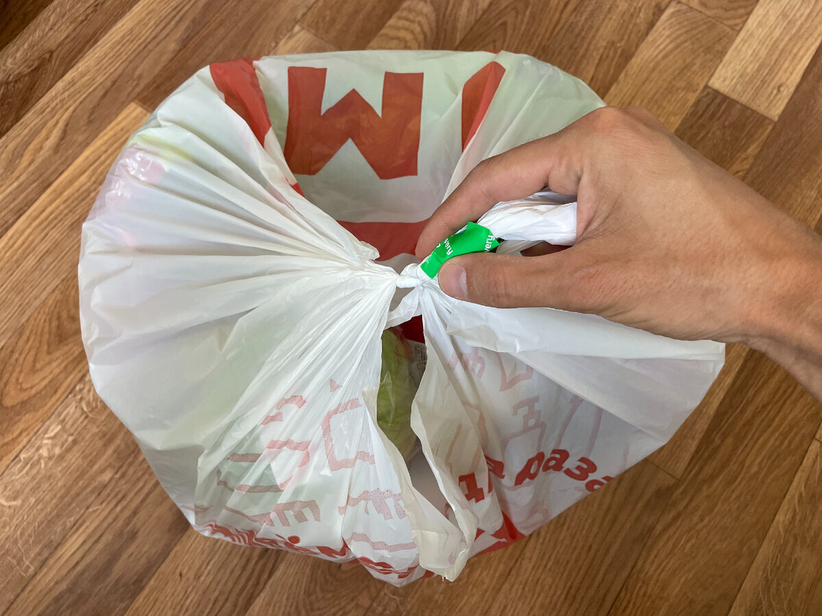 Ручки пакета заклеены "пломбой" Delivery Club. Вряд ли это гарантирует целостность заказа, но все же...