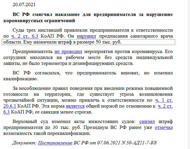 ВС РФ смягчил наказание для предпринимателя за нарушение коронавирусных ограничений.