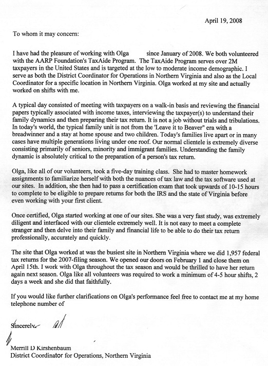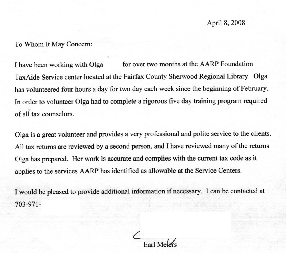 Как ни в какой другой стране, в Америке придают большое внимание рекомендациям – с мест работы, от друзей и родственников. Мой совет: собирайте всё, что можете: начиная от рекомендации от своей мамы и других волонтёров заканчивая портфолио достижений семьи. Мне это всё очень пригодилось. Договаривайтесь, регулярно созванивайтесь и поддерживайте связь со всеми своими рекомендующими, а также с контактным лицом в случае экстренного случая (emergency contact persons). Наконец, можно просто заплатить за эту услугу компаниям, которые занимаются подготовкой виз в США и помощью иммигрантам. Привожу примеры своих рекомендаций от Координатора Центра при библиотеки Шервуд, г. Александрия, шт. Вирджиния и Регионального Координатора по штату: