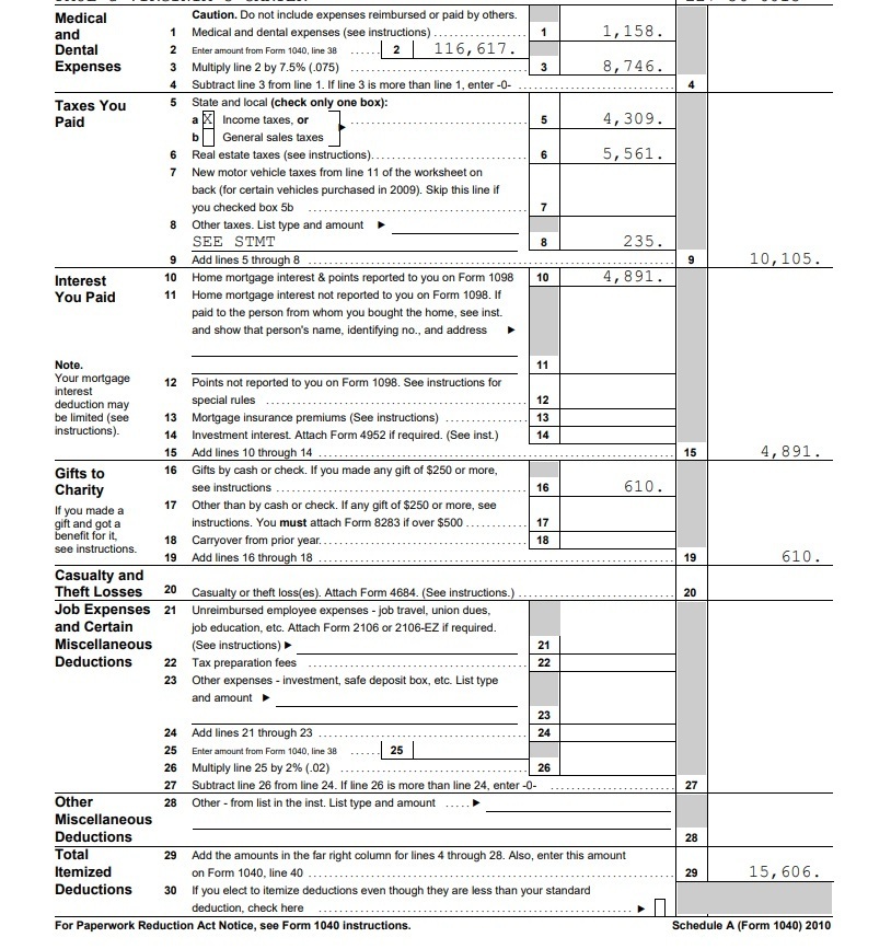 Второй важный момент в заполнении декларации, это – решить составить перечень перечислять делать постатейный вычет (itemize) в приложении «А» или брать стандартный вычет (standard deduction).