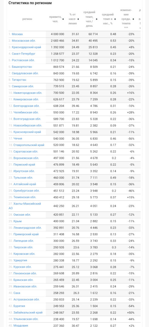 22 954 538 чел. (15.7% от населения) - полностью привито;