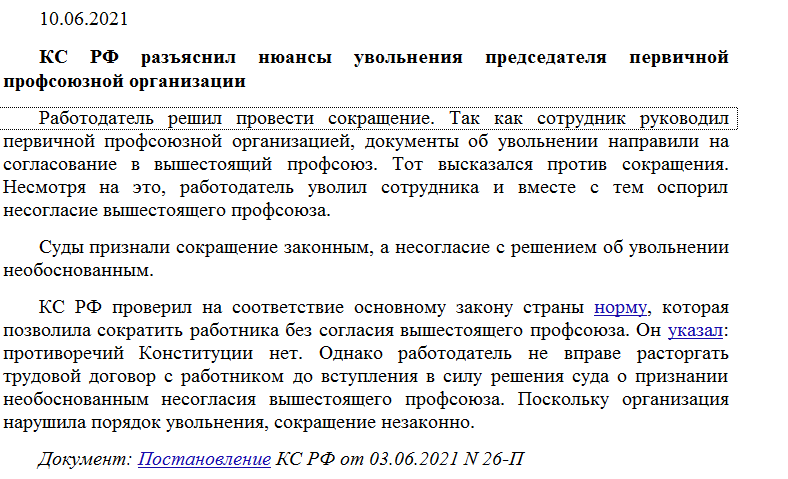 КС РФ разъяснил нюансы увольнения председателя первичной профсоюзной организации.