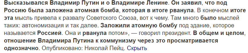 Именно этот очередной перл, я имел ввиду. Таких перлов у нашего "историка" хватает. Например, галоши для Африки или "папашка" Сталин или будем продолжать идти курсом, который, проложил ЕБН. Чего только он не выдавал.. Он не сказал, что именно разжигание межнациональной ненависти в республиках, после того, как снова напомнили людям о тиране Сталине и опорочив уже Ленина, дали им основания в 80-е выгонять русских со своих земель. Он Ленина обвинил.. Не горбача и Яковлева А, идеолога и прораба перестройки, который и начал эти процессы, а Ленина. Первую волну дал ренегат Хрущёв, вторую волну, Яковлев А, ударив не только по авторитету Сталина, но уже, и по авторитету Ленина. Сейчас, третья волна началась, по всем авторитетам+ по самому советскому строю. Можно понять выгоду каждого. Один, чтобы обелить себя, по причине того, что будучи первым секретарём на Украине, он репрессировал множество людей(Крым подарил) по этому же случаю.