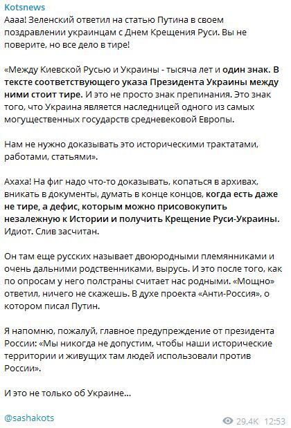 Коц прокомментировал слова Зеленского, который поздравил украинцев с "Днём Крещения Руси-Украины". Украинский лидер таким образом попытался дать ответ на статью президента России Владимира Путина и единстве русских, украинцев и белорусов, но всё вышло не как задумывалось.