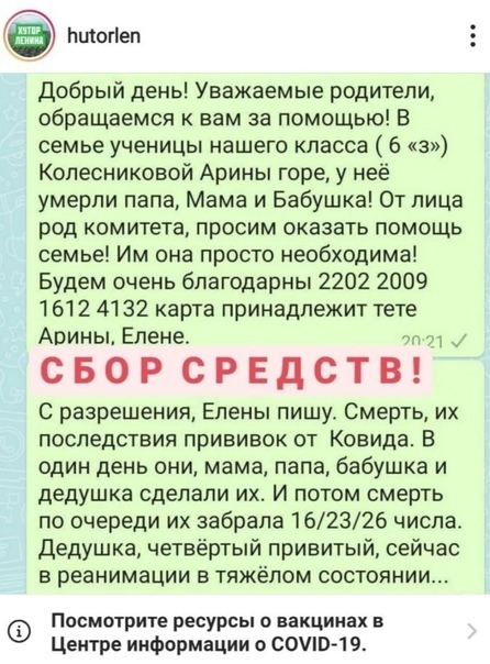 Не нагнетайте страстей, люди!!!! А делала ли эта женщина тест на антитела???? Скорей всего нет. И скорей всего у неё не выработались антитела!!! Есть такая категория людей, у которых вообще не вырабатываются антитела. Поэтому она и умерла. Тут надо шире рассматривать данную историю. НО НЕ НАДО СРАЗУ УТВЕРЖДАТЬ И НАВЯЗЫВАТЬ ДРУГИМ СВОЁ МНЕНИЕ, ЧТО ВАКЦИНИРОВАТЬСЯ НЕ НАДО, НАДО!!!!!! НАДО!!!!!!