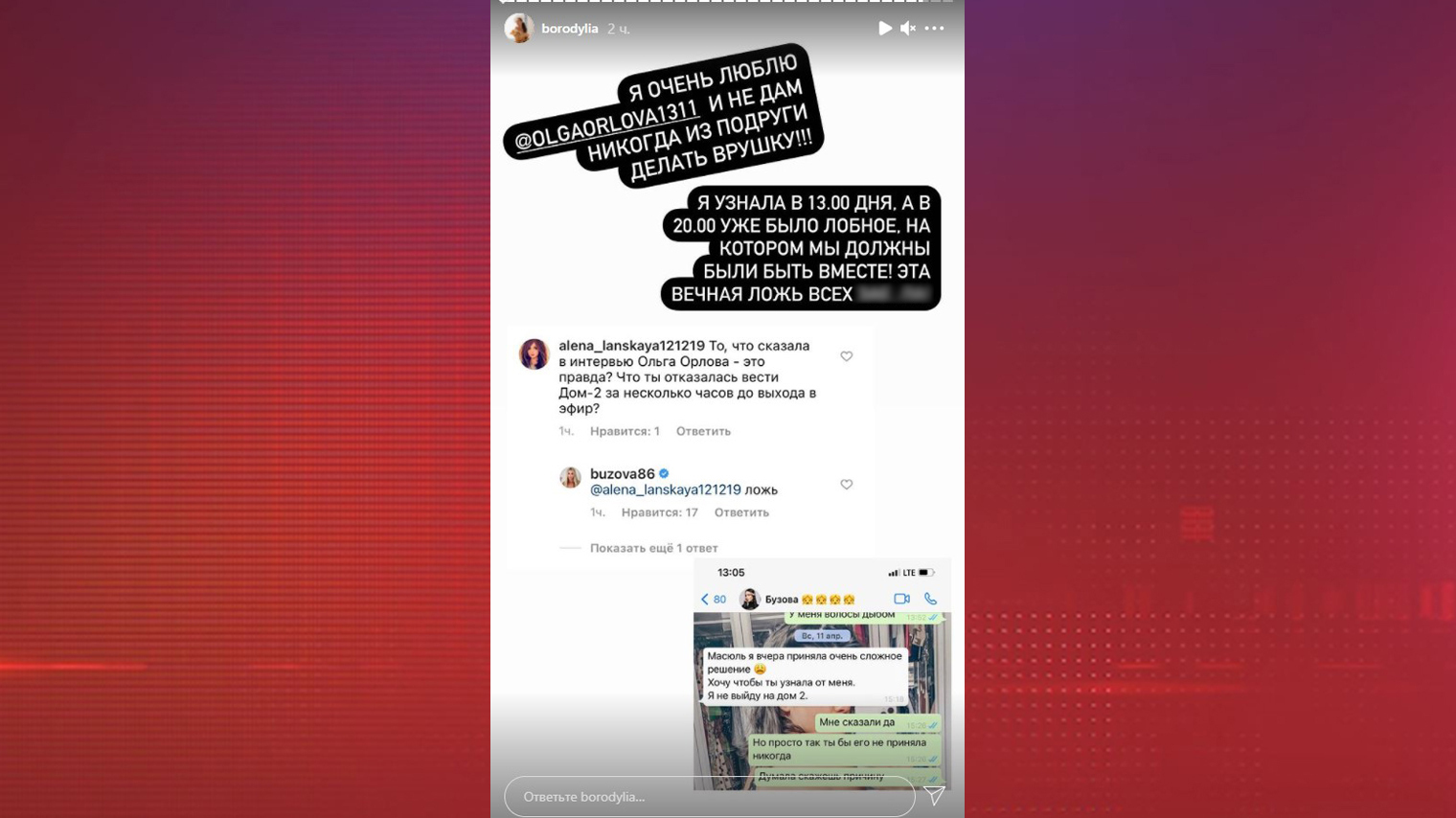У конфликта достаточно запутанная предыстория. Ранее Бузова отписалась от всех своих товарищей по «Дому-2» в соцсетях, заявив, что они — группировка, которая «воткнула ей нож в спину». После этого Орлова заявила, что категорически не согласна со словами бывшей коллеги. Она подчеркнула, что никого не предавала и узнала о дальнейшем неучастии Ольги в эфирах «Дома-2» за несколько часов до начала записи очередного выпуска. Бузова прокомментировала слова Орловой в общении с подписчиками.