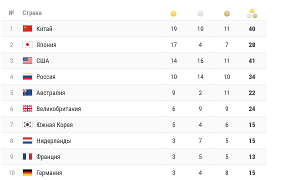 Таким образом, сборная Россия осталась на четвертом месте в медальном зачете Игр. В активе россиян 34 медали — 10 золотых, 14 серебряных и 10 бронзовых).