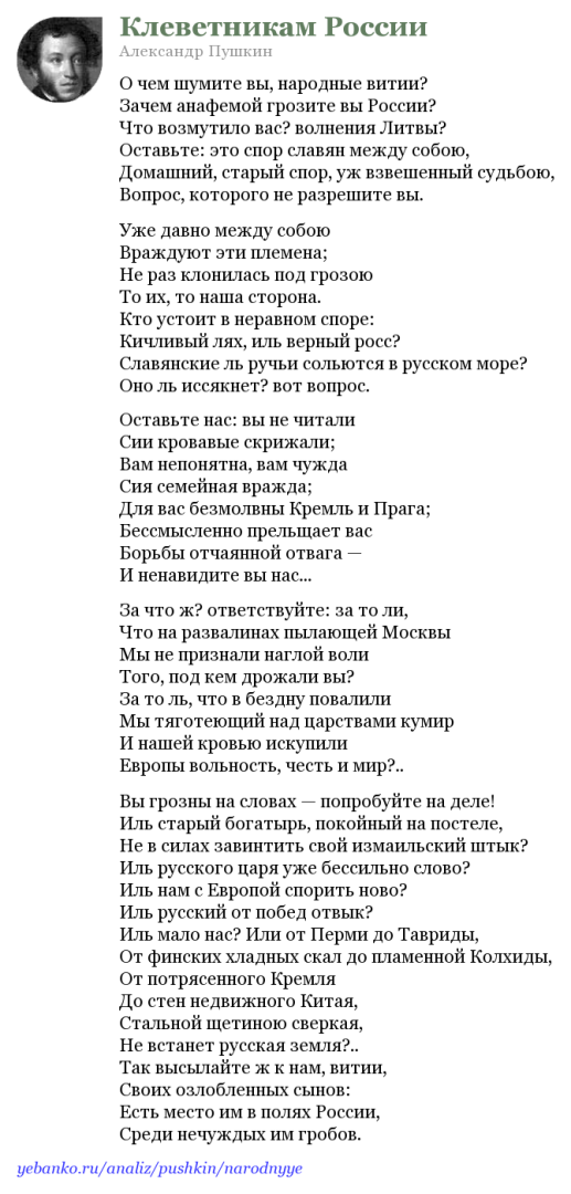 По-разному отнеслись к отклику Пушкина на польские события его друзья: отрицательно П.А. Вяземский и А.И. Тургенев; П.Я. Чаадаев же направил после публикации стихов их автору восторженное письмо, его позицию разделяли и ссыльные декабристы. Вместе с тем Ф.В. Булгарин, связанный с III отделением, обвинял поэта в приверженности либеральным идеям. Пушкин в свою очередь написал стихотворение, посвящённое русскому либералу: