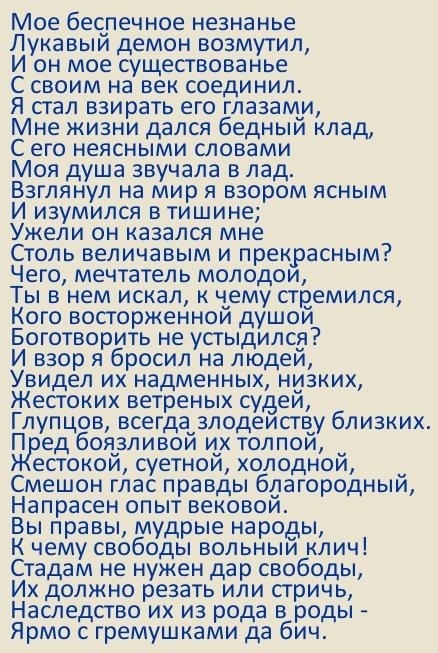 Больше всего его опечалило, что все ценности эпохи Просвещения, на идеалах которой Александр Сергеевич вырос, ничего не стоят в действительности. Он замечает, что люди вокруг грубы и жестоки по собственной воле. Поэт говорит о бесчеловечной толпе, готовой закрыть глаза на все злодеяния власти, и о том, что большинство счастливо служить господам и не слышит тех, кто призывает взять жизнь в свои руки.