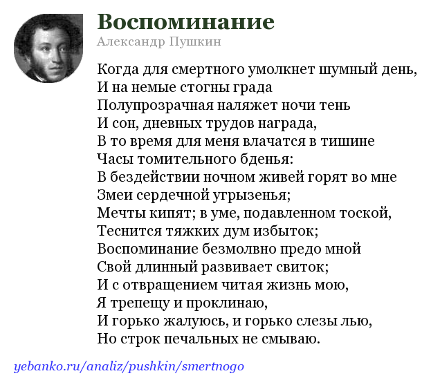 У Пушкина усиливаются настроения тоски и огорчения. Их лишь усугубляет недоброжелательное отношение критики, которое усиливается с тех пор, как поэт стал принадлежать одному литературному органу. В стихах этого периода отражаются его переживания. В стихотворении «Воспоминание» слышится безутешное отчаяние:
