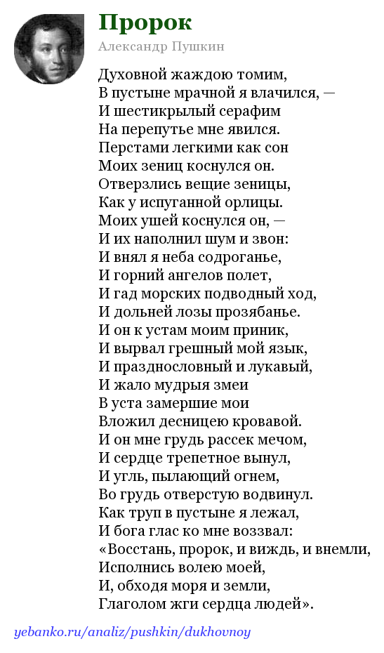 В 1826 году Пушкиным было написано стихотворение «Пророк», которое сразу же приобрело широкую популярность: