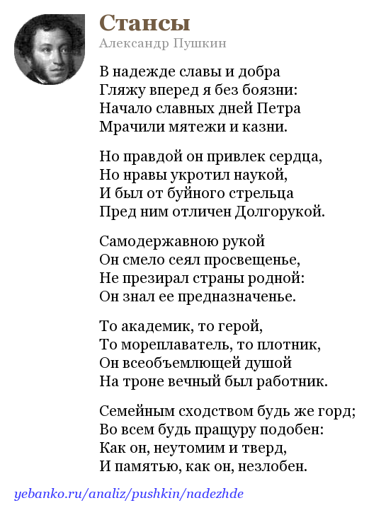 Находясь в ссылке в Михайловском, после подавления восстания декабристов Пушкин решил вступить с правительством в «лояльные, договорные отношения», чтобы вырваться из Михайловского, покончить с прошлым. По словам Георгия Федотова, написав стихотворение «Стансы», Пушкин заключил поэтический договор с Николаем I, предложив ему идеал Петра I: